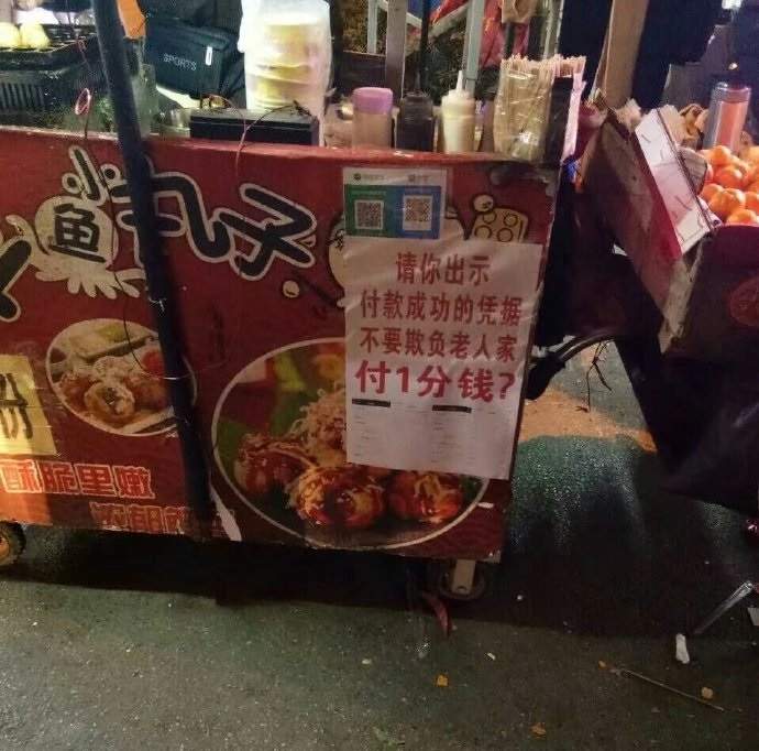 據@雲南高校新鮮事兒 微博消息,日前該賬號接到昆明某高校學生的投稿稱:在學校西門有一位老人賣章魚小丸子,為了方便大家支付,老人想辦法弄了一個掃碼支付,沒想到有的人居然欺負老人不懂,支付1分錢來忽悠老人家。