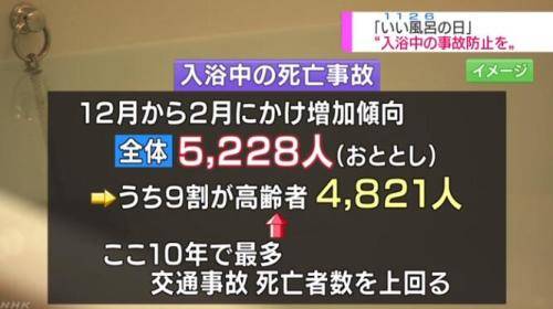 根據日本者消費廳數據顯示,2016年全年因為泡澡溺水死亡的人數為5228人,其中超過九成的4821人為老年人。這一數字為十年來最高,並且超過了因交通事故而死亡的人數。