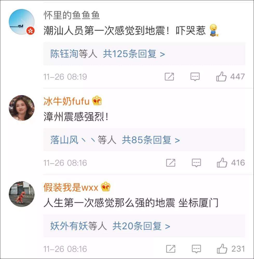 福建、廣東(廣州、深圳、東莞、潮汕等)網友紛紛表示有震感。