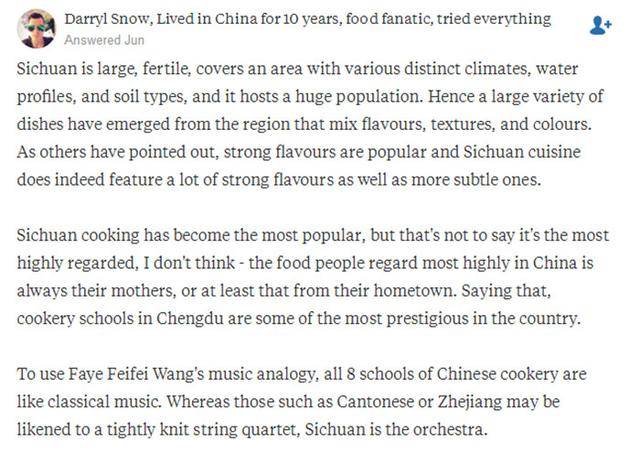 還有外國網友説道:“四川幅員遼闊,肥沃,覆蓋的氣候各異,土壤多樣,人口眾多。因此該地區混合了多種多樣的菜餚口味,質地和色彩,正如其他人所説的那樣,四川菜口味受到歡迎,川菜確實具有很多強烈的味道和微妙的口味,四川菜烹飪已經成為最受歡迎的,但這並不是説它最受尊敬,我不這麼認為。中國人最重視的食物始終是他們母親做的菜,或者至少是他們的家鄉菜,所以説成都的烹飪學校是這個國家最負盛名的。如果用音樂比喻,廣東菜和浙江菜都是比較緊密的絃樂四重奏,四川菜就是樂團。”