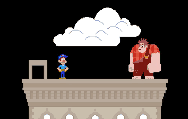 除了拉爾夫和雲妮所屬的《快手阿修》和《甜蜜衝刺》外,畫面裏還有《英雄使命》《吃豆人》《超級酒保》《旋風快打2》《街頭霸王》《太空侵略者》《青蛙過河》《跳舞機》…
