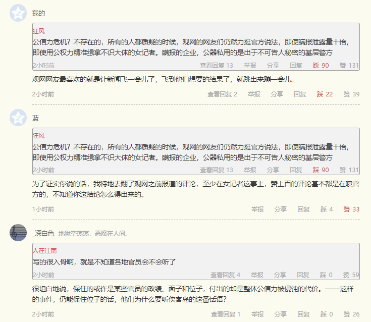 然後,我接着看後續報道“女記者採訪碳九事故被精準查房 泉州警方:涉事民警停職”。熱評欄是這樣的: