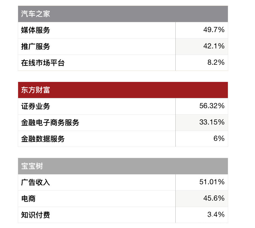 從變現模式來看,汽車之家主要由媒體服務(49.7%)、推廣服務(42.1%)、在線市場平台(8.2%)三部分構成。東方財富則由證券業務(56.32%)、金融電子商務服務(33.15%)、金融數據服務(6%)構成。再看寶寶樹是由廣告收入(51.01%)、電商(45.6%)、知識付費(3.4%)構成。