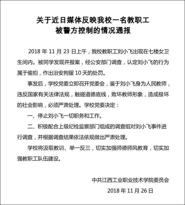 江西工業職業技術學院在其官網發佈的情況通報稱,2018年11月23日上午,我校教職工劉小飛出現在七樓女衞生間內。被同學發現並報案,經公安部門調查,認定劉小飛的行為屬於偷拍,作出治安拘留10天的處罰。