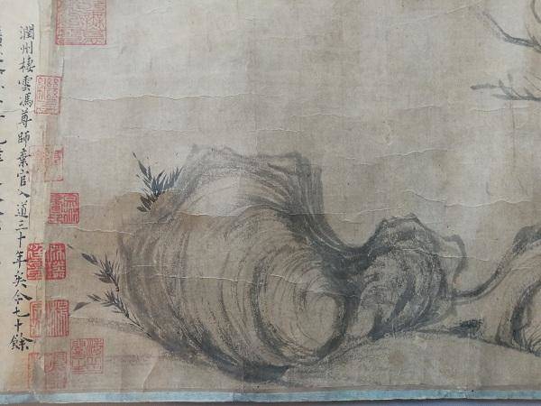 長久不知去向的歷程,為《木石圖》覆蓋了一層神秘面紗。近代著錄中對《木石圖》有詳細記載者,為知名古書畫鑑定家張珩(1915-1963)所著的《木雁齋書畫鑑賞筆記》,然此著錄所參照的並非原跡,而是日本出版之珂羅版印刷品,且為“爽籟館藏”,故可知《木石圖》曾為日本收藏家阿部房次郎(1868-1937)之藏品。據張珩記載:“此卷方雨樓從濟寧購得後乃入白堅手,餘曾許以九千金,堅不允,尋攜去日本,阿部氏以萬餘得去。”可知張珩曾試圖向白堅購入《木石圖》而未得之經過。