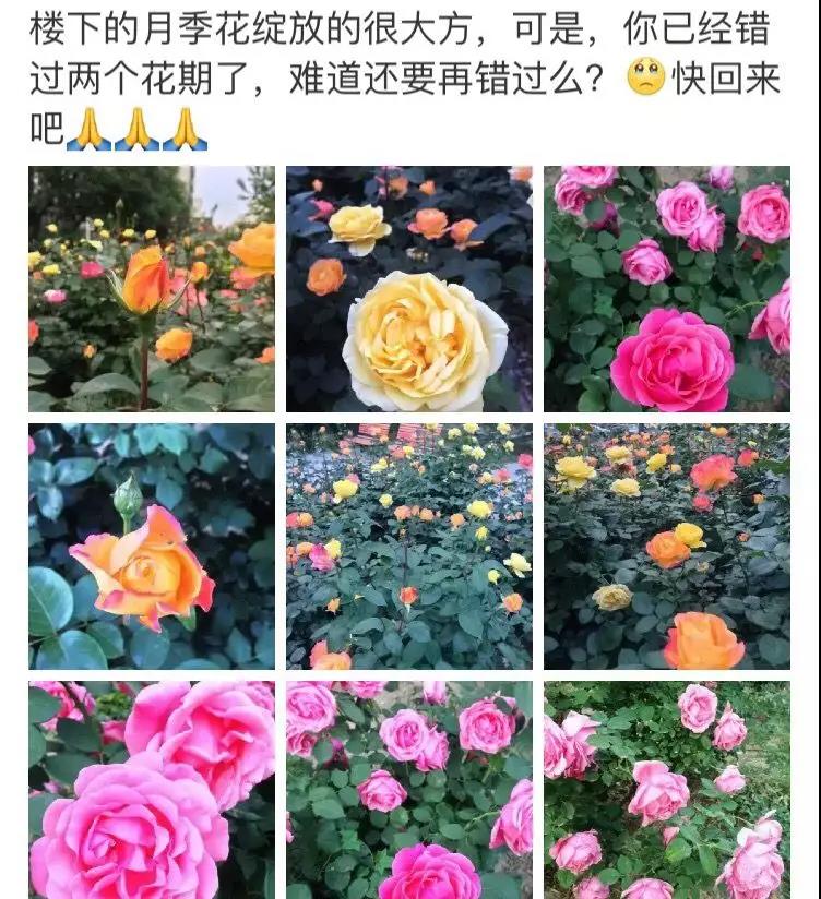 “樓下的月季花開了,你已經錯過兩個花期了,難道還要再錯過嗎?快回來吧。”