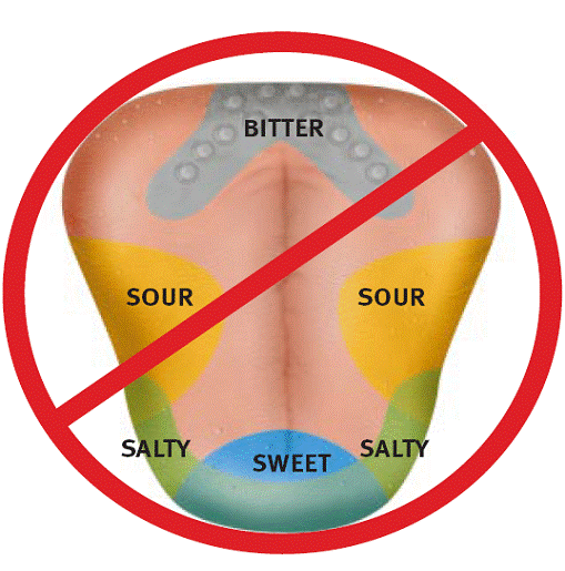 然而這件事是,不靠譜的。就目前為止,研究發現並被廣泛接受的味覺細胞,(也就是組成味蕾的細胞)可以感受5類物質:酸(Sour),苦(Bitter),鹹(Salty),甜(Sweet)和鮮(Umami),可能存在的還有第六類味覺細胞可以感受脂肪(Fat)。
