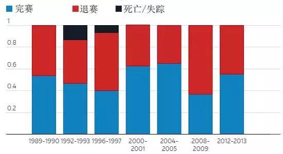 參賽人數少,能堅持完賽者更是罕見。比賽中能順利到達終點的選手通常只有半數,1996年,16名參賽選手中僅有6位堅持了全程,完賽率僅為37%,賽事歷史上也不乏經驗豐富的航海家殞命途中,據外媒統計,旺代帆船賽的死亡率高達4.5%,而太空旅行的死亡率為3.7%,在“屍體當路標”的珠穆朗瑪峯,攀登者的死亡率為4.4.%,兩相對比,難度與危險係數不言而喻。