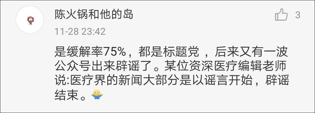 相關刷屏文章標題稱治癒率高達75%,但事實上是有效率高達75%,有效率高並不代表真正治癒率高,很多藥物雖然有效,但不能維持很長時間,並不算治癒!換而言之,有效率=緩解率。