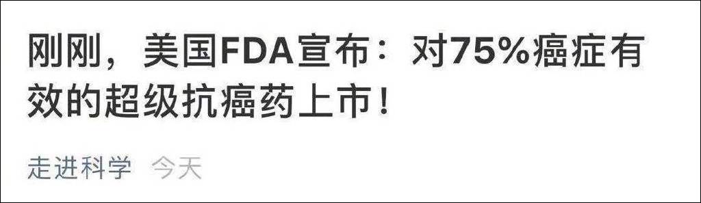 多個微信公眾號發佈消息聲稱,“重大突破!美國FDA正式上市“廣譜”抗癌藥治癒率高達75%!”