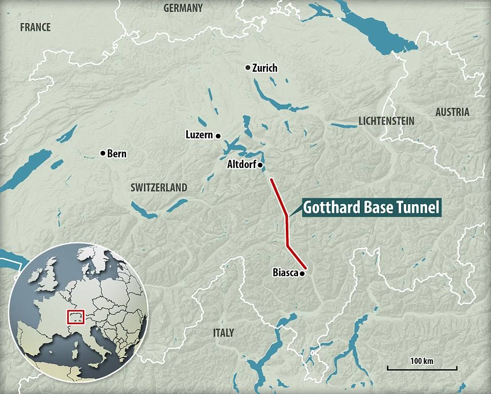 聖哥達基線隧道,全長57千米,橫穿歐洲阿爾卑斯山脈,被譽為歐洲團結象徵。