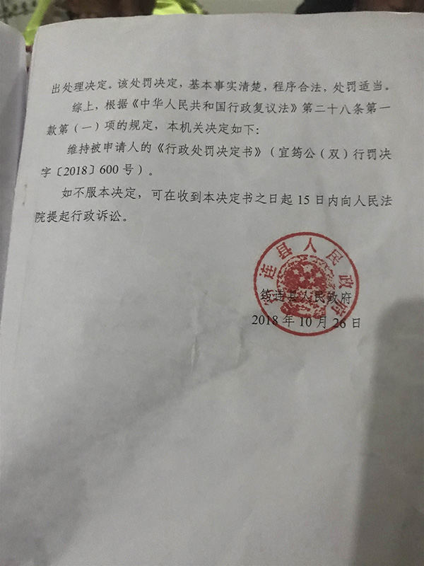 筠連縣政府出具行政複議決定書維持警方處罰決定。