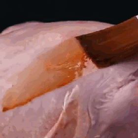像這樣用強力膠把雞皮表面的洞補上,把雞翅粘牢,之後調一碗上色用的“塗料”——布朗寧醬、比特酒、黃色食用色素和洗潔精。最後將塗料均勻地刷在雞肉表面就可以了。