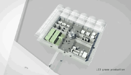 農場底層設有温室,對牧草進行無土栽培。利用LED照明燈,牧草每天的光照時間可以長達20小時,這樣牧草將生長的更快。
