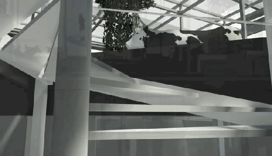 頂層為温室,用於種植三葉草、苜蓿等可作為奶牛飼料的農作物。中層為奶牛放養層,平台將飼養40頭奶牛,每天可生產約800公斤牛奶。這是一個封閉的空間有茂盛的綠草和樹木,像是自然的草原一樣,奶牛可以自由走動。
