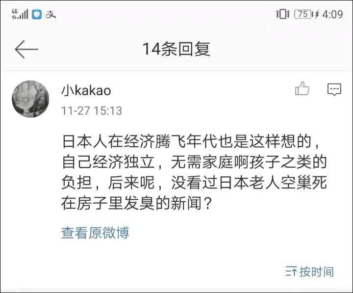 有網友舉了日本的例子説,日本人在經濟騰飛年代也是這樣想的,自己經濟獨立,無需家庭孩子之類的負擔。這名網友提醒博主説,你有沒有看過日本空巢老人死在房子裏發臭的新聞?
