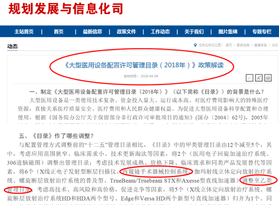 據《中華人民共和國國家衞生健康委員會規劃發展與信息化司》官網上題為《關於發佈大型醫用設備配置許可管理目錄(2018年)的通知》與【《大型醫用設備配置許可管理目錄(2018年)》政策解讀】的內容信息顯示,“內窺鏡手術器械控制系統調整至乙類管理目錄”。