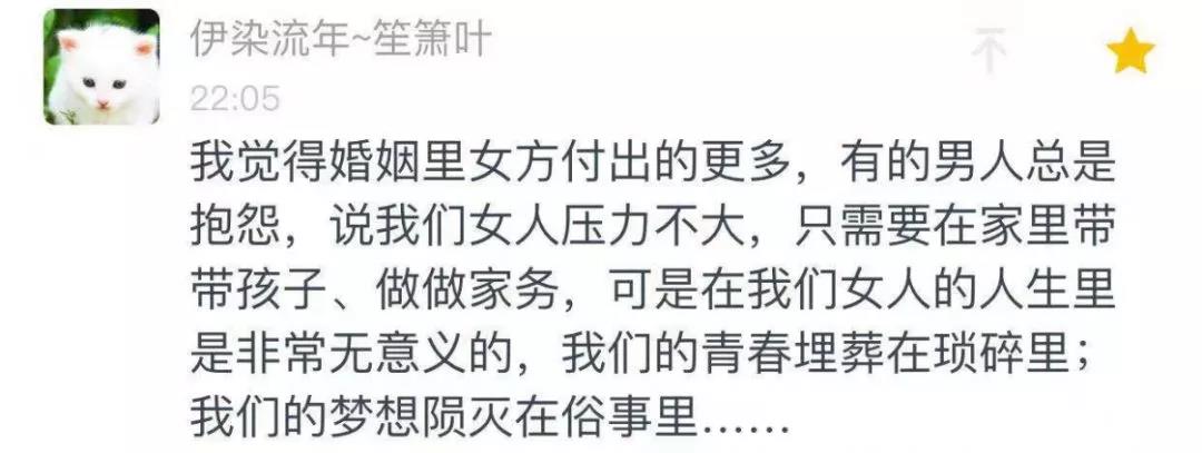 一位讀者給叔留言,非常在理:“有的男人總抱怨,説我們女人壓力不大,只需要在家裏帶孩子、做做家務,可有些在我們女人的人生裏是非常無意義的,我們的青春埋葬在瑣碎裏;我們的夢想隕滅在俗事裏……”