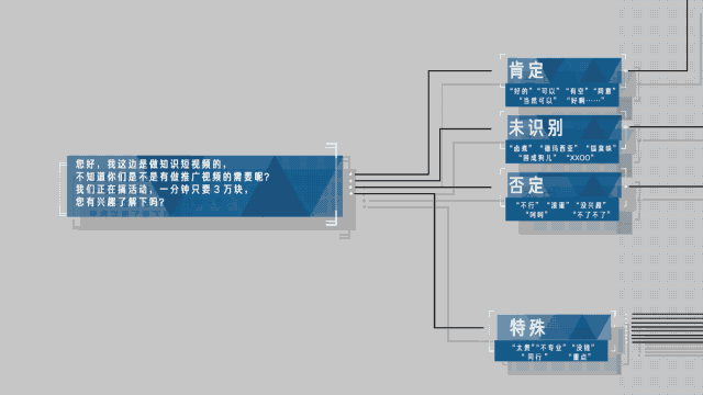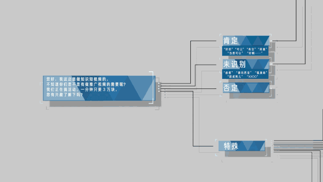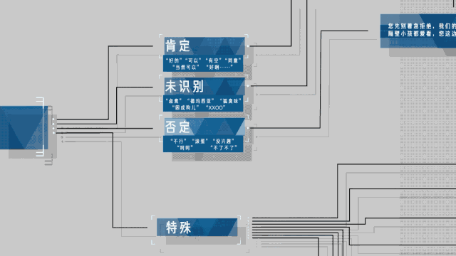 每播放一段錄音,機器人就會根據關鍵詞判斷對方的狀態,歸類為四種:肯定、否定、未識別、特殊。