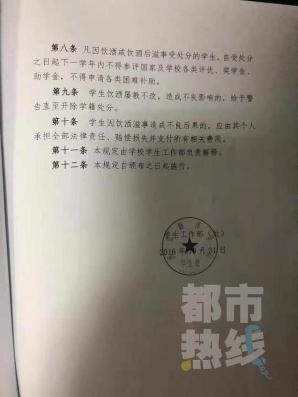 其中第三條提到,嚴禁學生在校學習生活期間飲酒(含酒精度飲料),學生因生日、節假日、入學、升學、畢業等原因在校內外組織的聚餐活動一律不得飲酒。第四條還規定,嚴禁教職工和學生飲酒,一經發現,由學校人事部門按照學校制度處理。而飲酒或酒後滋事被處分的學生,最嚴重的將會被開除學籍。