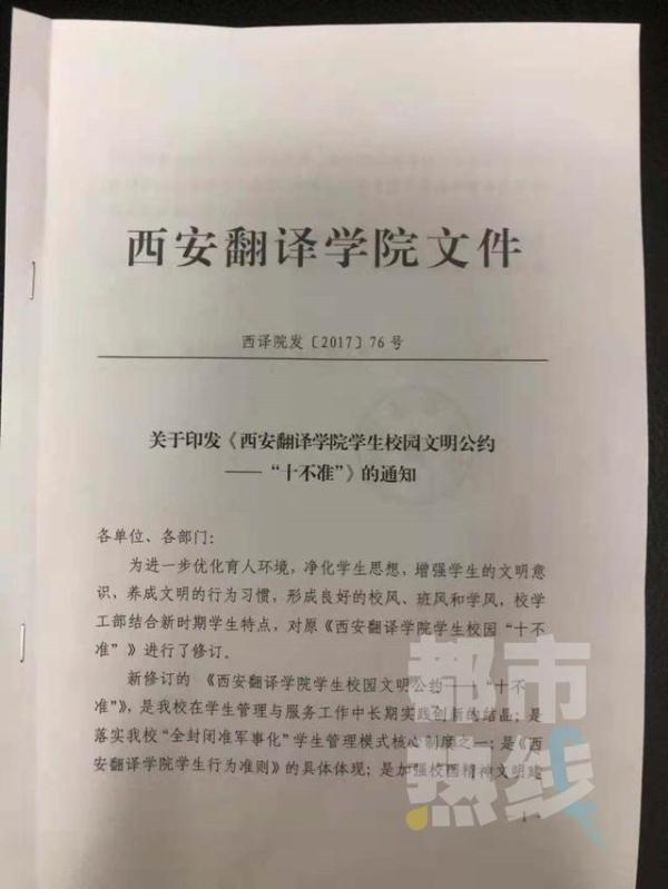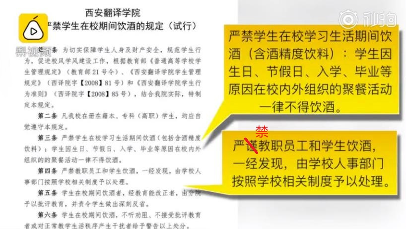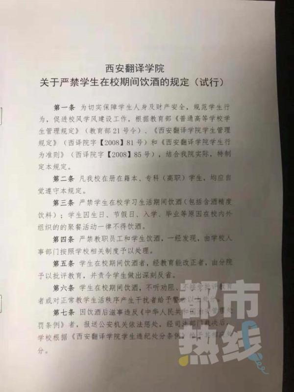 綜合多家媒體報道,在這份名為《西安翻譯學院嚴禁學生在校期間飲酒的規定》的文件中,對於學生飲酒做出了非常嚴格的限制。