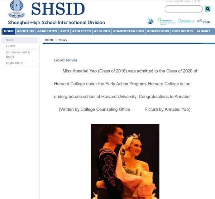 從網上很容易獲得的信息看,Annabel此前就讀於只招收外籍的上海中學國際部,她是在2015年底被哈佛提前錄取的。Annabel最早在香港,後來去了英國,隨後在上海7年,15歲起在上海的金寶龍芭蕾舞教室學習芭蕾舞。