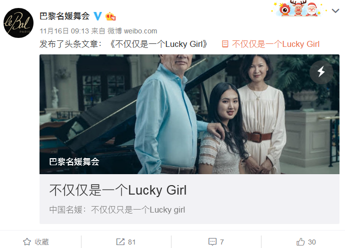 據國內媒體報道,Annabel此次受邀,是由澳門賭王何鴻燊的女兒何超欣引薦的。何超欣去年參加了巴黎名媛舞會,她和Annabel是好閨蜜,同在美國波士頓讀書,Annabel就讀於哈佛大學計算機科學專業,何超欣就讀於麻省理工學院。