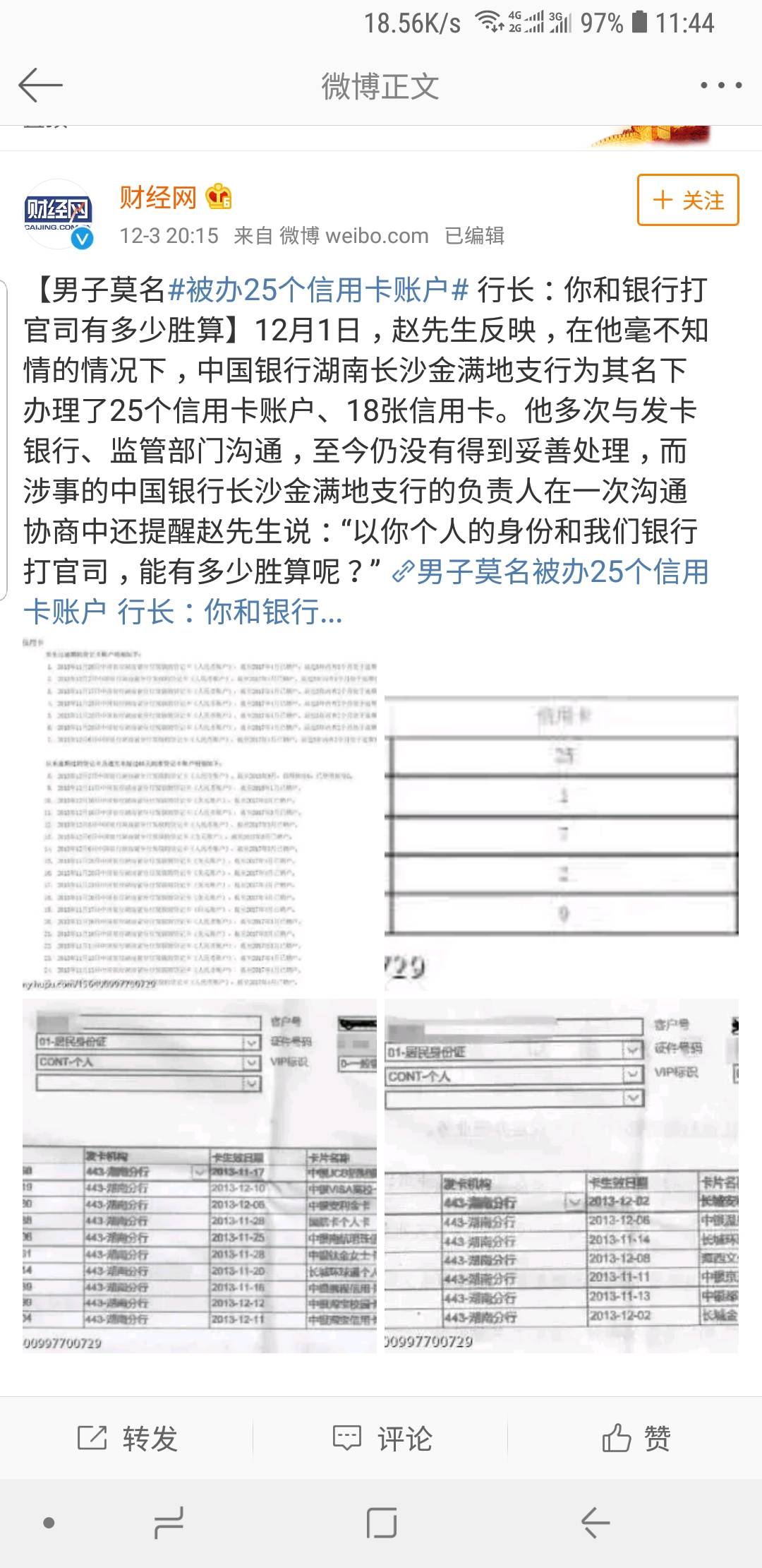 12月1日,趙先生反映,在他毫不知情的情況下,中國銀行湖南長沙金滿地支行為其名下辦理了25個信用卡賬户、18張信用卡。他多次與髮卡銀行、監管部門溝通,至今仍沒有得到妥善處理,而涉事的中國銀行長沙金滿地支行的負責人在一次溝通協商中還提醒趙先生説:“以你個人的身份和我們銀行打官司,能有多少勝算呢?”