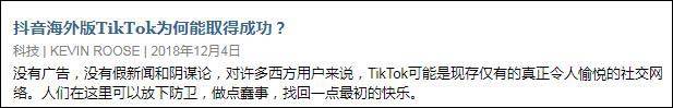12月4日,紐約時報發了一篇文章,對抖音(Tik Tok)一頓表揚,最引人矚目的莫過於這句話“對很多西方用户來説,Tik Tok可能是現存僅有的真正令人愉悦的社交網絡”。