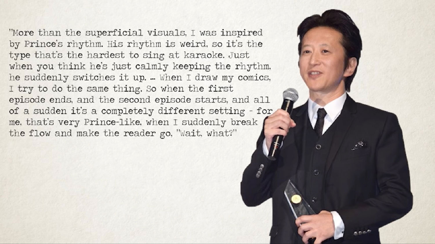 “比起表面的視覺衝擊,Prince歌曲的旋律給了我更多的靈感。它的旋律可以用古怪來形容,就是那些在卡拉OK裏最難唱的那種歌。正當你以為他在努力保持音樂的平緩時,他卻突然峯迴路轉。我在畫漫畫時也試着去做這種變化。比如故事在第一章看似結束,卻在第二章突然有了一個全然不同的開始,這種風格對於我來説和Prince的非常相近。讀者也會因此發出驚歎。”