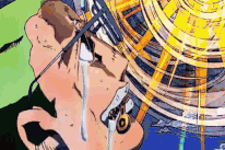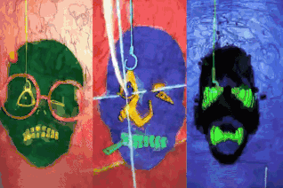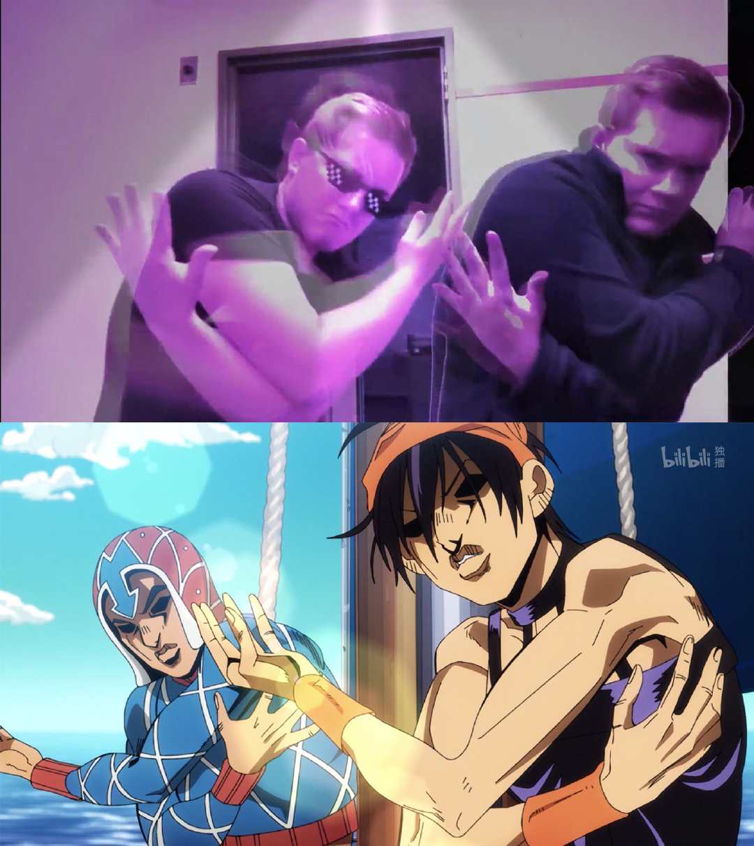 而在以下三段充滿波普氣息極具色彩張力的鏡頭中,扭曲的人臉變化與洗腦背景音樂完美地交融在一起,對人類最原始最狂燥的審美衝動產生一次又一次的猛烈撞擊。從左至右分別象徵着三位舞者的替身能力:米思達的“性感手槍”;納蘭迦的“史密斯飛船”;以及弗高的“紫煙”,體現出製作組在劇情暗示上的小心思。相信我,盯着這張動態圖看,你會發現自己很難將視線轉移開。如果你並不關注JOJO卻因此發出類似“我在看什麼,這東西為什麼如此好看”的感嘆,那麼恭喜你,你也是一名JO廚了。