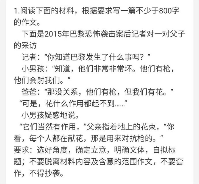 而在社交媒體上,有網友翻出一道關於2015年巴黎恐怖襲擊的作文題,引起了很大的爭議。