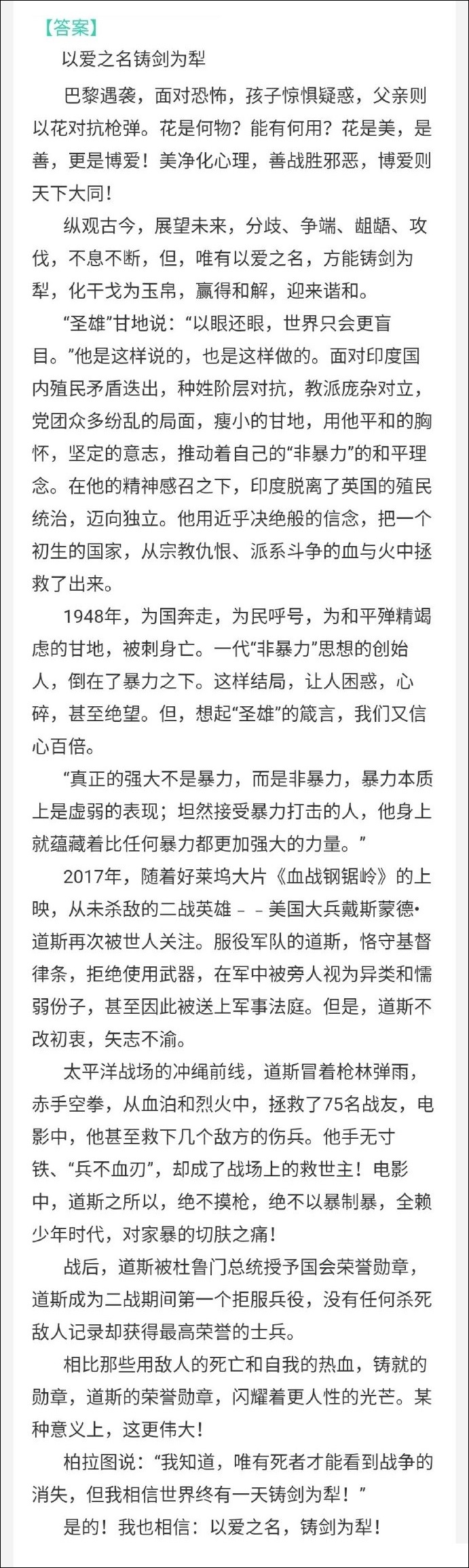 ②從安吉爾勒説的“這是用來對抗槍的”的角度,可立意為:和平與正義必勝;痛苦是暫時的,和平是人類永恆的追求;