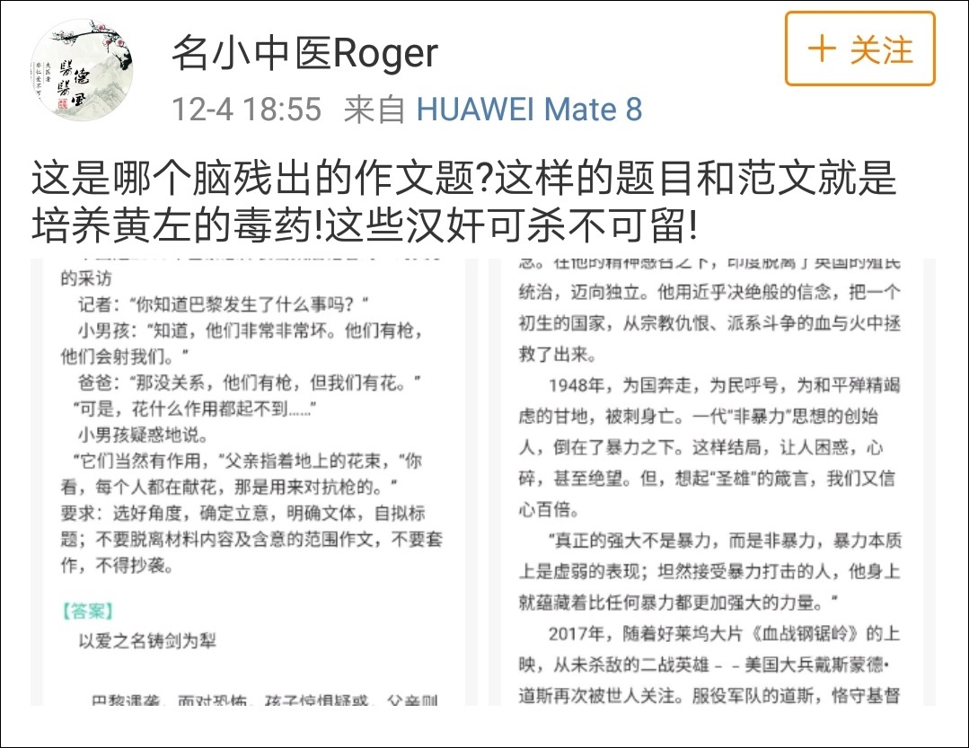 這樣一道作文題,以及它的範文在社交媒體上引起關注。多數網友批評,這道作文題實在是誅心,到底在傳達的是什麼扭曲的觀念,投降主義嗎;也有一部分網友認為,題目出得很客觀啊,難道不教導“真善美”的觀念,而是教導孩子舞槍弄棒,喊打喊殺嗎?