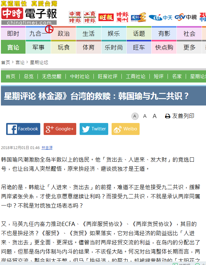 《中時電子報》:台灣的救贖:韓國瑜與九二共識?_風聞