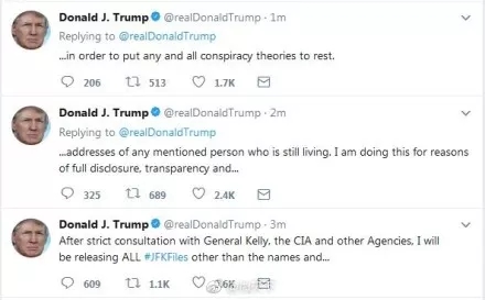 有意思的是特朗普的表態,下令公開部分被封存的檔案後,他發微博説:在與凱利將軍、中情局和其他機構的嚴格磋商後,我將公佈除涉及仍在世者的姓名和住址之外的所有“肯尼迪檔案”,我這麼做的原因是為了完整披露、透明以及平息所有的陰謀論。