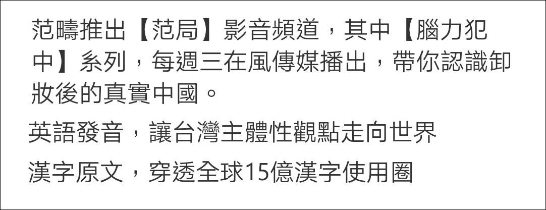 據節目介紹,《腦力犯中》是範疇推出“範局”(有種“王志安-王局”的既視感)影視頻道下的一個系列節目,號稱是要帶觀眾認識“卸妝”後的真實中國,每週三在台灣媒體風傳媒平台上播出。需要強調的是,這個節目還是一個雙語節目:英文旁白+中文字幕。