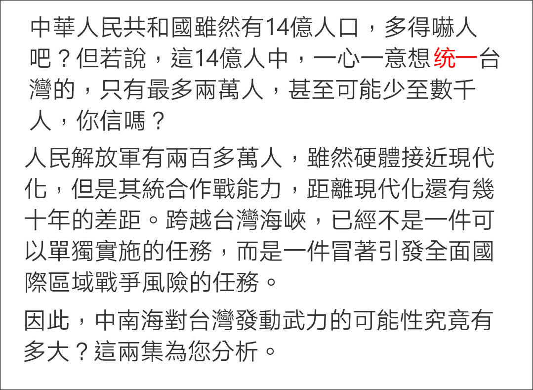 2.恐懼第一種人,而只是嘴上附和但心底裏知道“併吞”台灣對中國未來是不利的人;