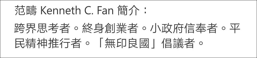 在港台媒體上介紹,範疇,紐約哥倫比亞大學哲學碩士、台灣大學哲學學士,新加坡國家初級學院理科。求學在台、美、新多地,在大陸北京也居住長達20年,自認為自己見識過“素顏”的中國。他是連續創業者,從數位教育到人力資源、企業與組織戰略等行業,目前還致力於寫作。是兩岸知名的時政評論家、台灣資深專欄作家,對於兩岸未來趨勢有獨到的觀察與見解。