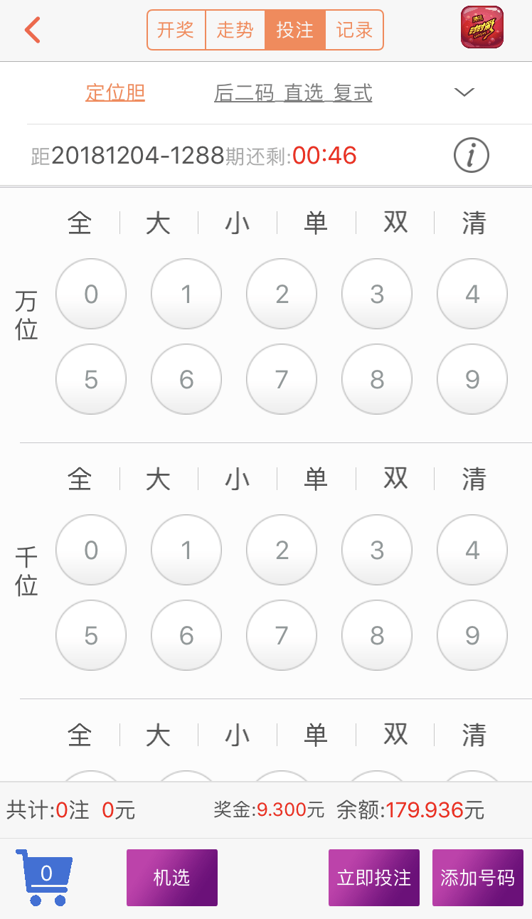每選擇一個號碼即代表一個單位,而可選擇的單位有元、角、分、釐,倍數依照自己的倉位自行選擇。舉例來説,若將單位選為元,號碼選擇6個,1倍。那麼中獎後實際可以收入9元,另有3元為平台抽成。