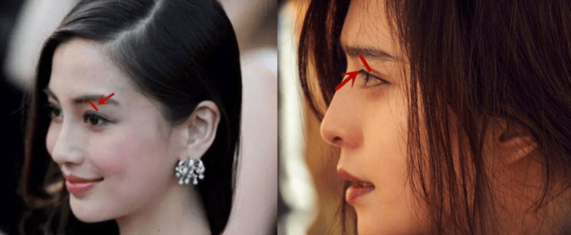 劉亦菲眉骨較低,眉骨過度到眼睛沒有凹陷,相較范冰冰、baby的高眉骨,深眼窩,更具東方特色。