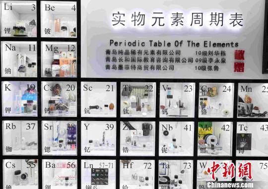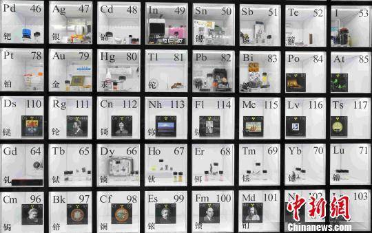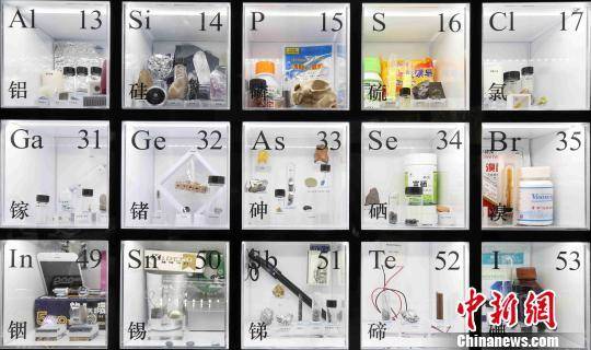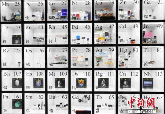 中新網青島12月5日報道: (記者 胡耀傑)化學元素週期表被做成了像格子鋪一樣的展櫃,一個個玻璃小瓶裏,裝着煉出來的各種元素。活潑的鈉、鋼鐵俠的鈀、絢麗的鉍……