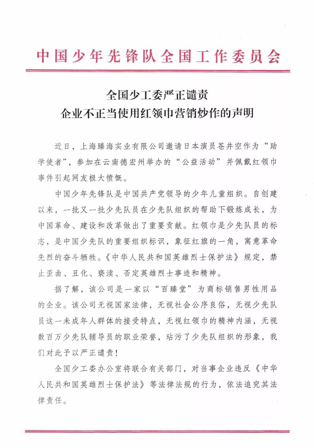 據瞭解,該公司是一家以“百臻堂”為商標銷售男性用品的企業。該公司無視國家法律,無視社會公序良俗,無視少先隊員這一未成年人羣體的接受特點,無視紅領巾的精神內涵,無視數百萬少先隊輔導員的職業榮譽,玷污了少先隊組織的形象,我們對此予以嚴正譴責!全國少工委辦公室將聯合有關部門,對當事企業違反《中華人民共和國英雄烈士保護法》等法律法規的行為,依法追究其法律責任。
