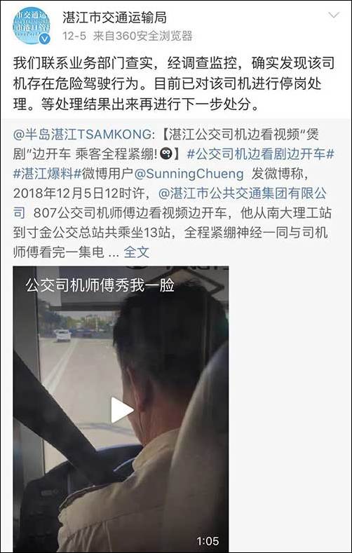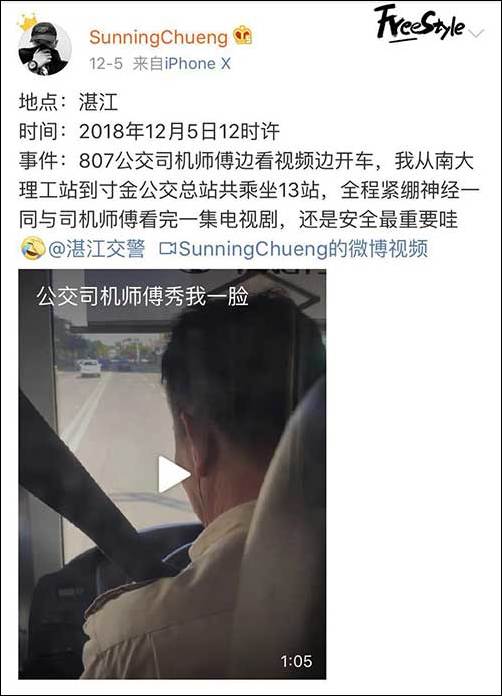 微博網友@SunningChueng 12月5日爆料,當天12時許,在廣東湛江乘坐807路公交車時,發現司機竟然邊看視頻邊開車,且時間長達二三十分鐘。該網友稱自己一共要坐13站,全程精神緊繃,遂錄下視頻,和司機一起看完了一集電視劇。