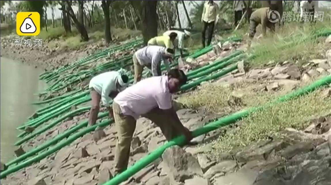 這些村民將一根根綠色的水管塞進湖泊裏,日以繼夜地通過這些水管將湖水全部排出去。