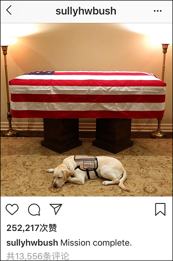 這張照片中,Sully躺在老布什靈柩前,雙眼緊閉,貌似哀傷,圖片配字“Mission complete(任務完成)”。