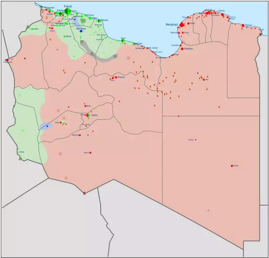 ·利比亞國內局勢的現狀。紅色為阿聯酋支持的哈夫塔爾控制,談綠色為“政府”控制,深綠色為卡塔爾支持的伊斯蘭民兵組織控制,藍色為一些地方武裝,黑色為伊斯蘭國殘餘勢力。
