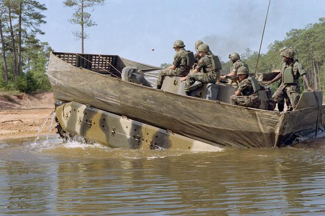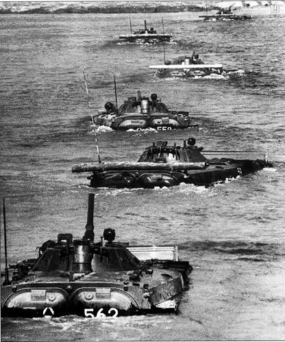 由於擔心進水沉沒,在演練中,士兵都坐在車頂上,便於逃生,戰時這樣還不如在水裏拖根繩子游泳過去安全點