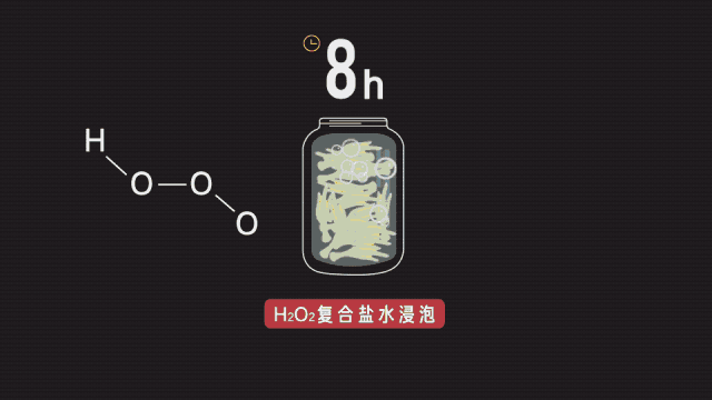 為了讓雞爪呈現純白色,需要在含有雙氧水的複合鹽水中浸泡 8 小時以上,再煮熟,進入調製好的泡椒水中泡製 10 小時以上,就完成了一隻含鹽量 3.5% 的泡椒鳳爪。