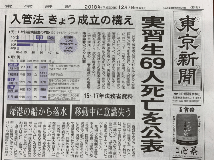 圍繞着日本如何接受外國人勞動力的《入管法》修正案的審議和討論,在日外國人技能實習生的生活、工作狀態等人權問題的真相也凸現出來。12月6日,在日本參議院法務委員的審議過程中,應立憲民主黨的邀請,日本法務省不得不提交出來一份震動了全場的相關資料。這份資料的調查表明,從2015年到2017年的三年間,在日本的外國人技能實習生有69人死亡。作為中國人記者,我肯定要敲着黑板繼續劃重點——69名死亡者中,從性別上看,男性為54人,女性為15人;從年齡層來看,20歲到30歲的有46人,30歲到40歲的有19人,還有10歲到20歲的兩人。從國別上看,中國人死者最多,達到32人,幾乎佔了死亡者的一半!越南人死者排在第二位,達到26人。